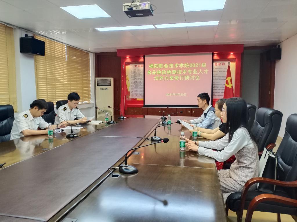 2021年4月29日,我系食品教研室主任李涛、食品专业教师梁锦丽、黄莹星一行走进揭阳某直属单位,共同开展我系2021级食品检验检测技术专业人才培养方案修订研讨会。会议由我系食品教研室主任李涛主持。