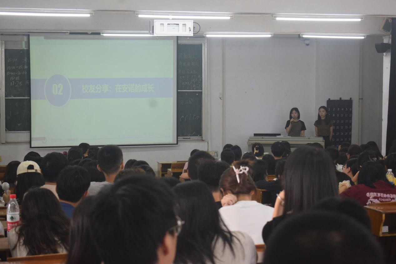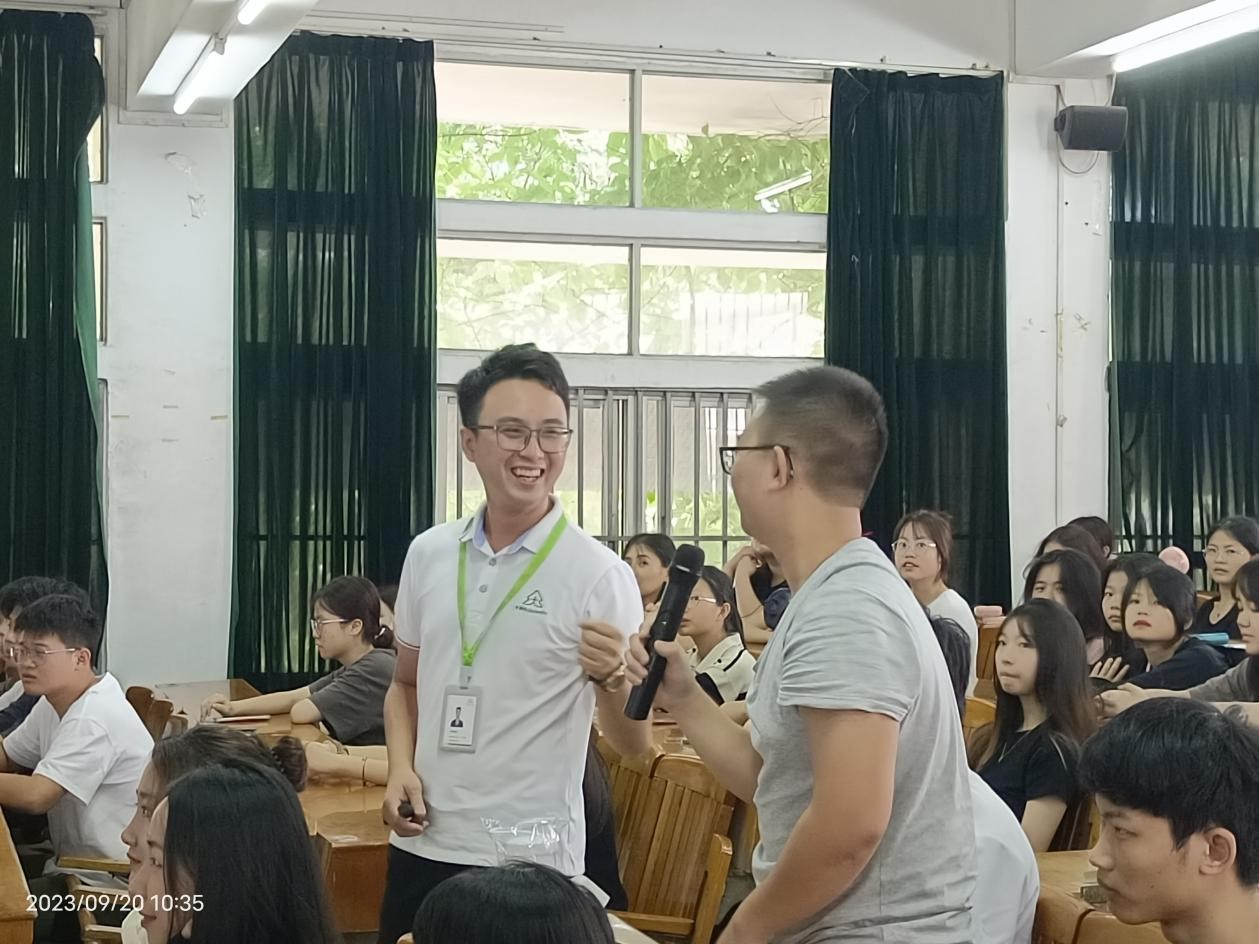 9月20日,药企进校园宣讲活动在教学楼BT22举行,来自大参林医药股份有限公司粤东片区人事经理辛瑞权介绍了公司的业务领域、发展现状及未来规划,展示了公司在健康产业中的突出成就和积极影响力,分享了公司的企业文化和工作环境,就公司的招聘需求、员工培训、福利待遇等问题与同学们进行互动交流,鼓励同学们要认真学习,提前做好职业规划,树立目标并为之奋斗。广东安诺药业股份有限公司的代表李丹曼从医药行业的角度出发,讲述了公司在研发、生产、销售等环节的运营情况,以及公司在行业中取得的荣誉和成果。同学们对医药企业的生产研发和人才需求情况很感兴趣,不时与企业代表互动交流,现场气氛活跃,掌声热烈。