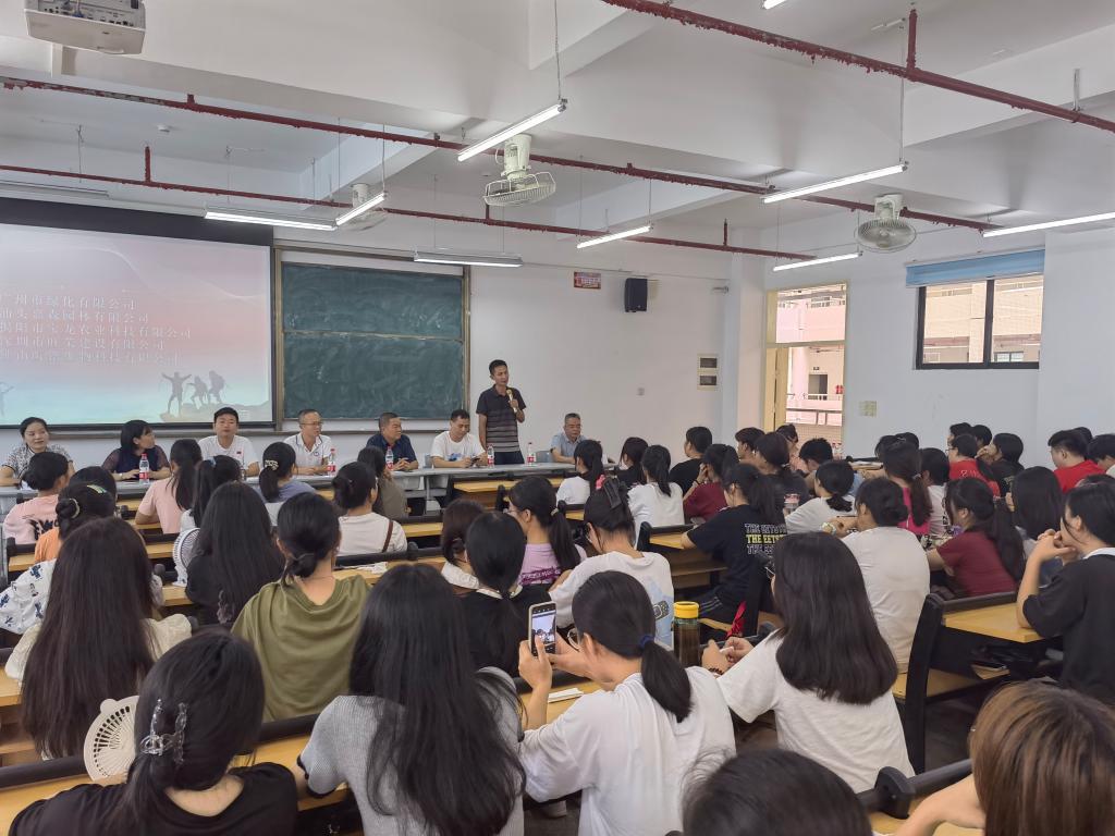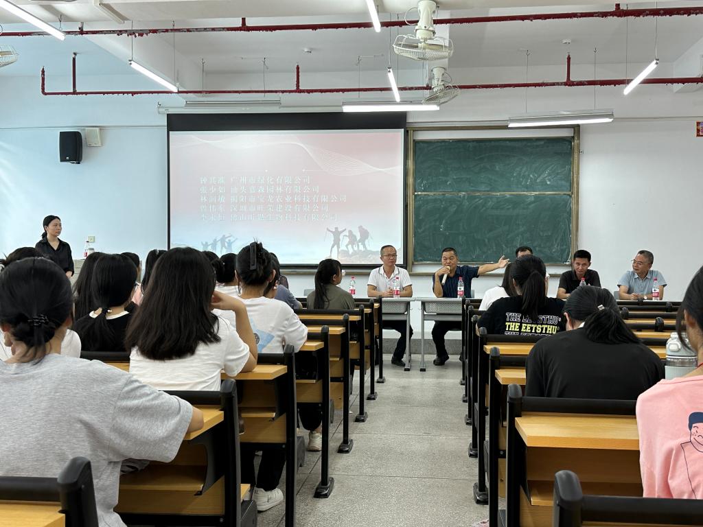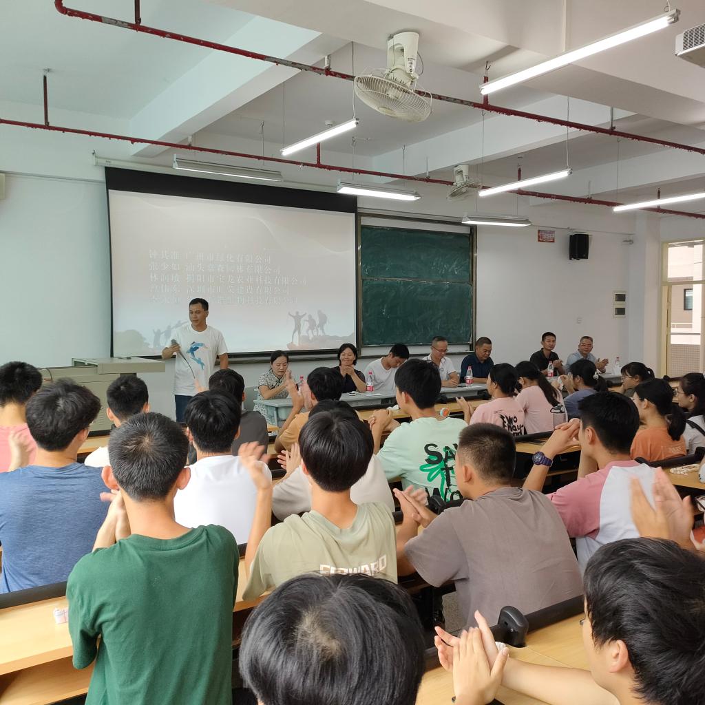 汕头嘉森园林有限公司创始人张少如、佛山昕锴生物科技有限公司总经理李永恒、揭阳市宝龙农业科技有限公司创始人林润敏、广州市绿化有限公司高管钟其准、深圳市旺荣建设有限公司总经理曾伟东等优秀校友从珠三角及周边城市专程回校出席本次交流分享会。会上,师兄师姐分别作了自我介绍,并分享了个人成长经历、工作情况以及对园林行业发展前景的看法,在校生热情高涨,掌声阵阵。在互动环节,在校生积极提问,提出了包括专业发展方向、就业岗位、创业经验、植物新品种专利、学历提升、工资待遇等各面的问题,师兄师姐一一耐心做了精彩的解答,并提醒新生们要踏踏实实学习好专业知识,切实提高专业技能,根据自身兴趣爱好做好职业规划,刚踏入职场时可能会面临各种挑战,需要吃苦耐劳,忍受孤独,经过一定时期的积淀才能成长成才。