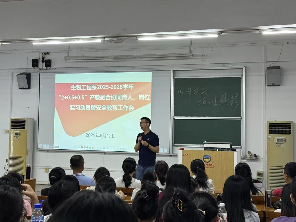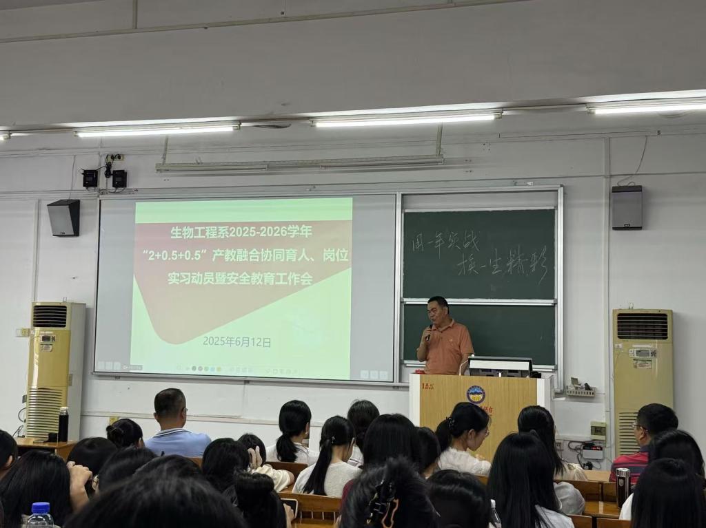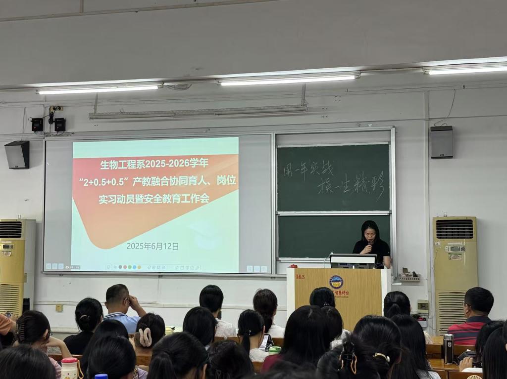 为贯彻落实国家产教融合相关政策,根据我校《揭阳职业技术学院关于推进产教融合人才培养模式改革的实施意见》,高效推动我系2023级学生“2+0.5+0.5”模式的产教融合协同育人教学和岗位实习工作,我系于6月11日在教学楼CT32开展生物工程系2025-2026学年“2+0.5+0.5”产教融合协同育人教学和岗位实习动员暨安全教育工作会。